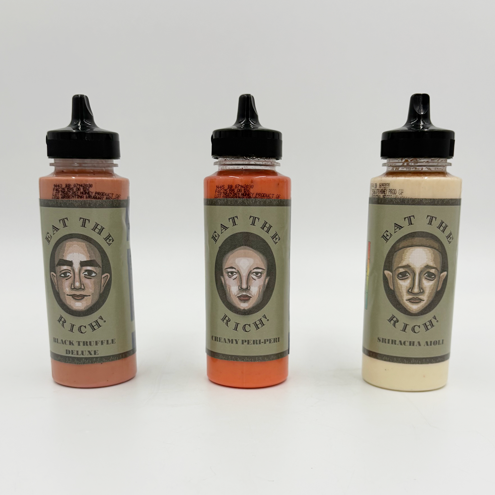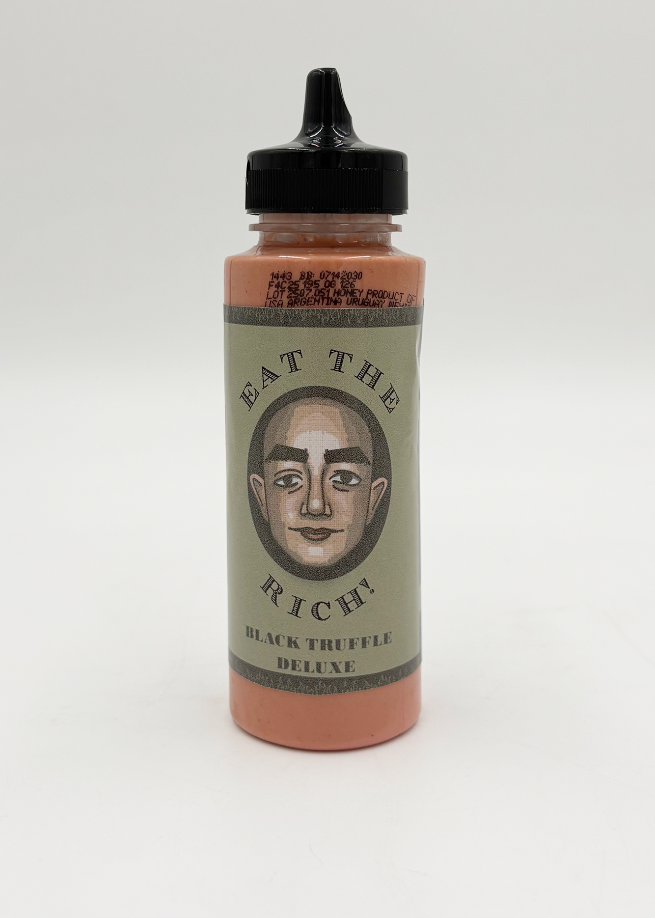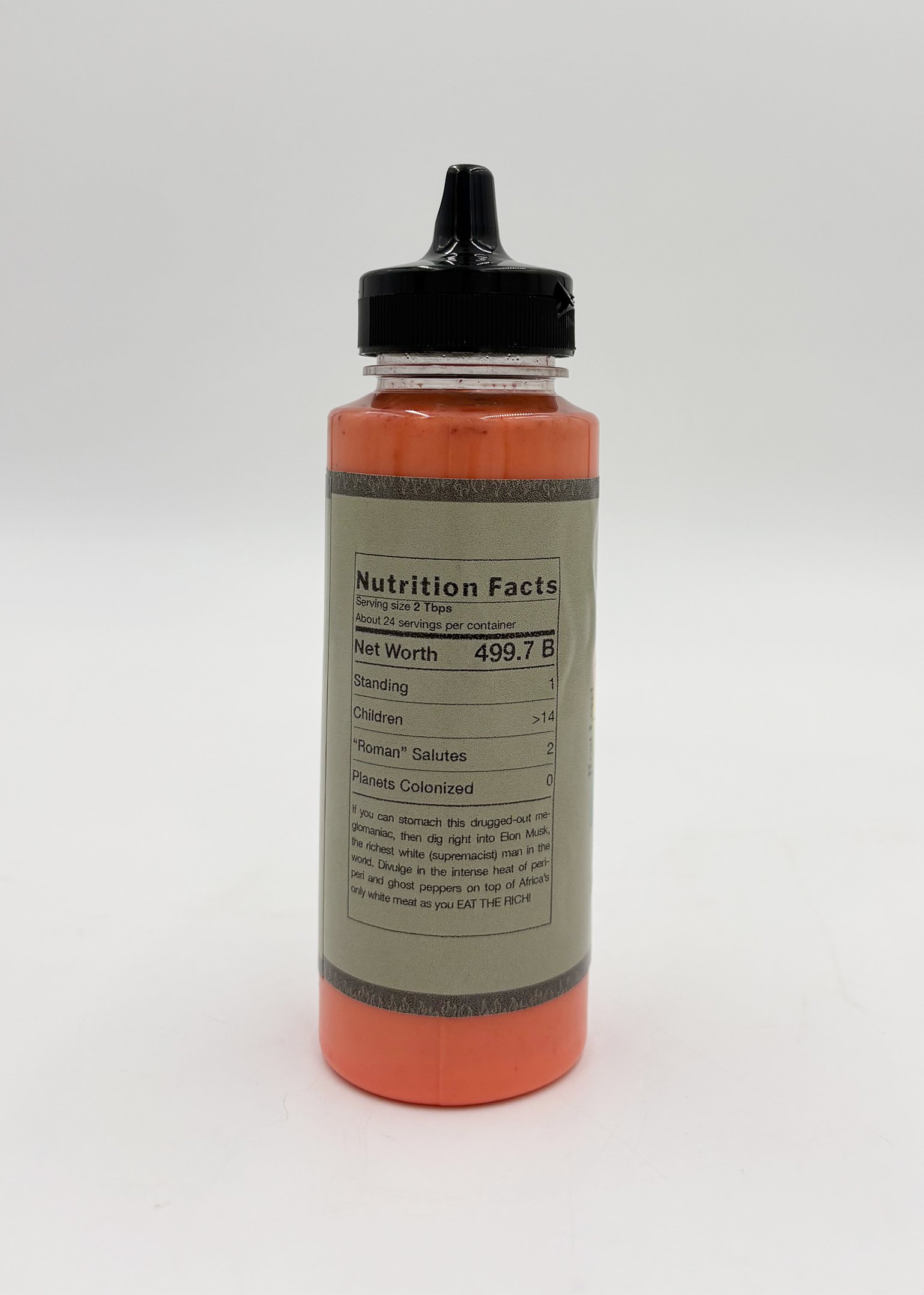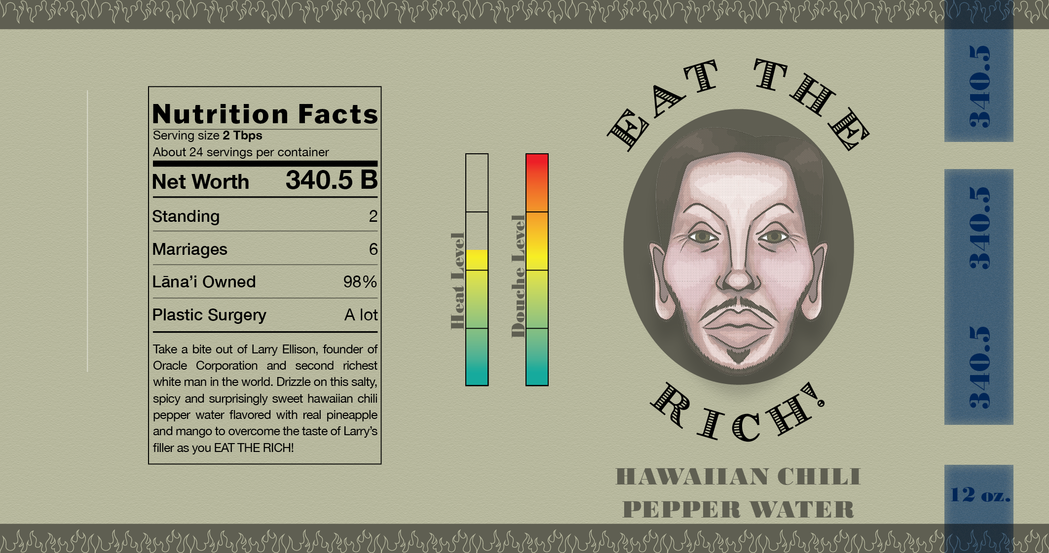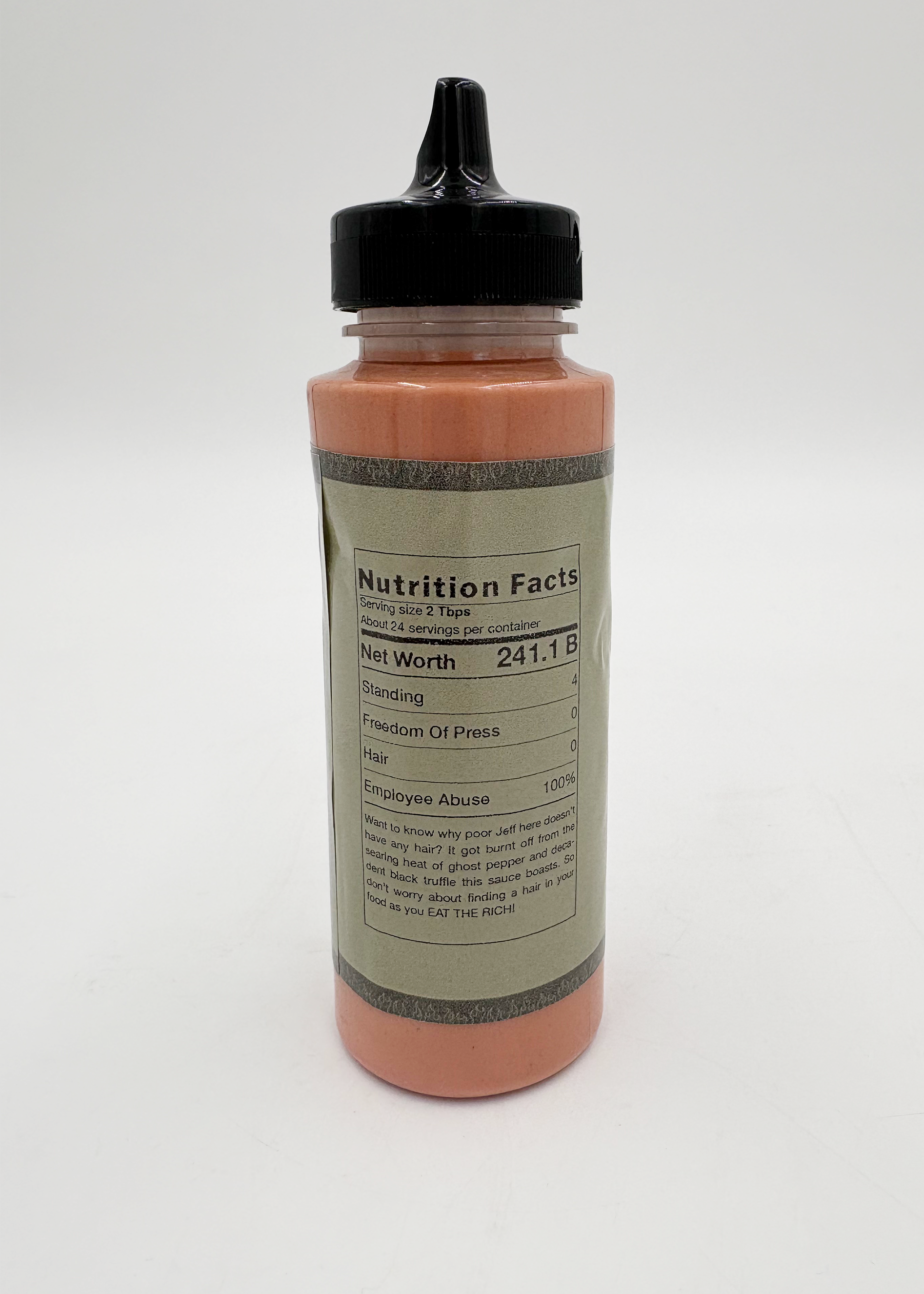 So I got to thinking, as one with an active imagination does, about this term of non-endearment and came upon a very odd but valid question. What sauce would we dip these rich losers in if we actually ate them? Putting into consideration how these men completely lack taste and decorum, I decided to make a line of fictional hot sauces one could potentially drizzle on their meat morsels. EAT THE RICH!